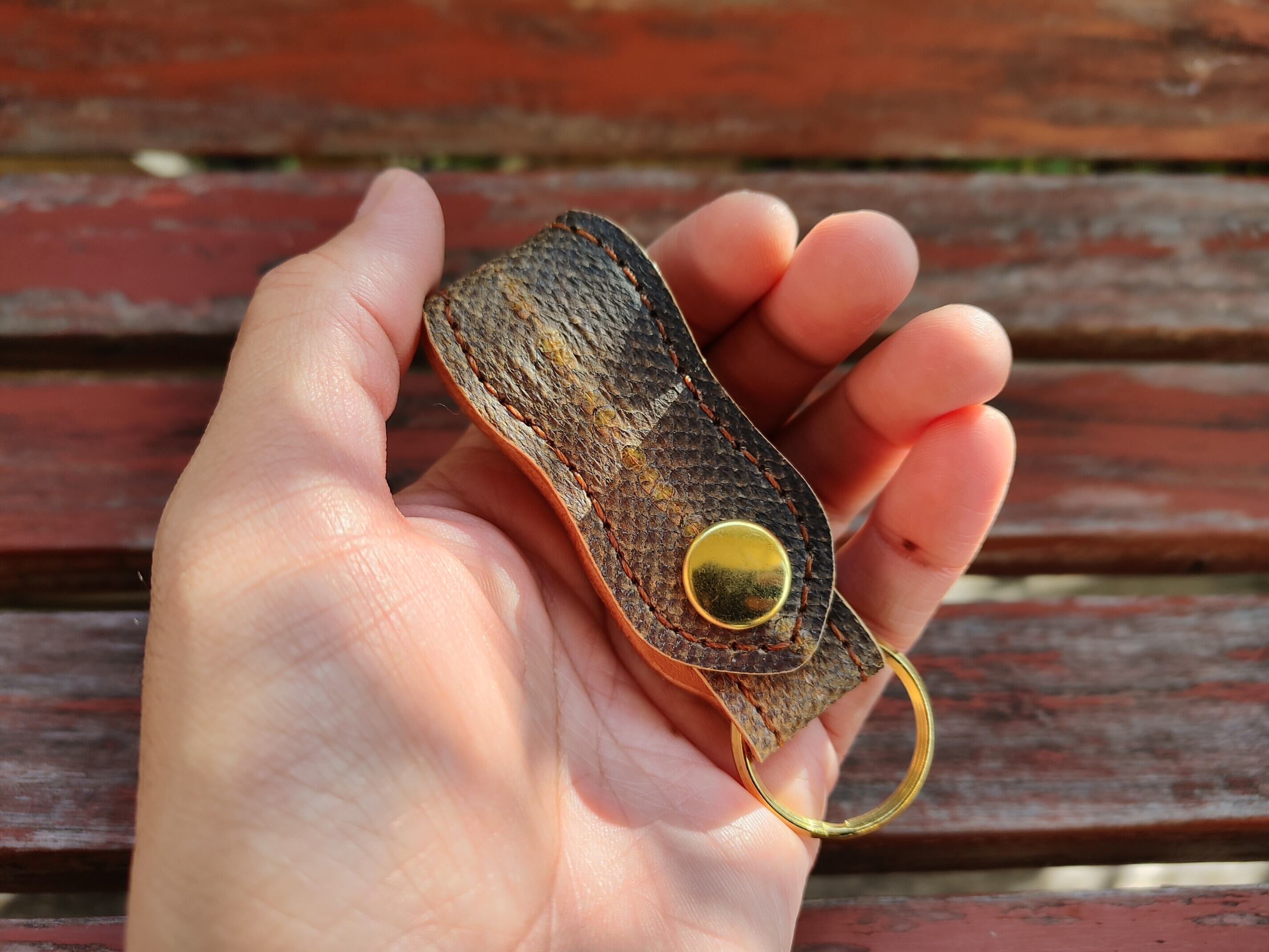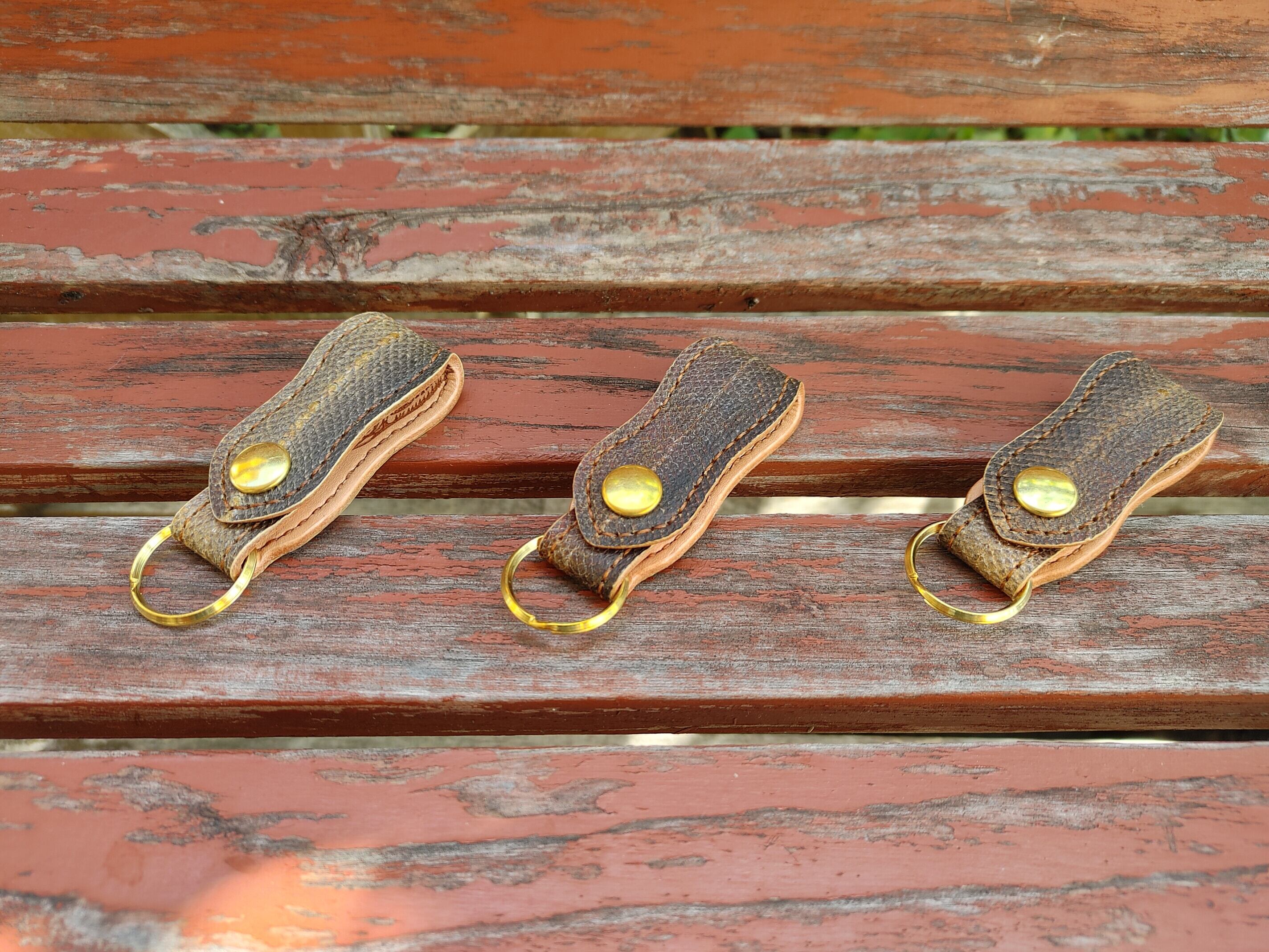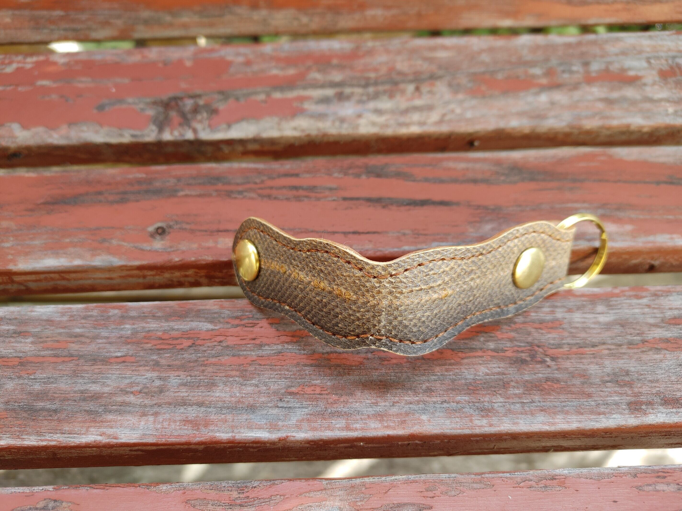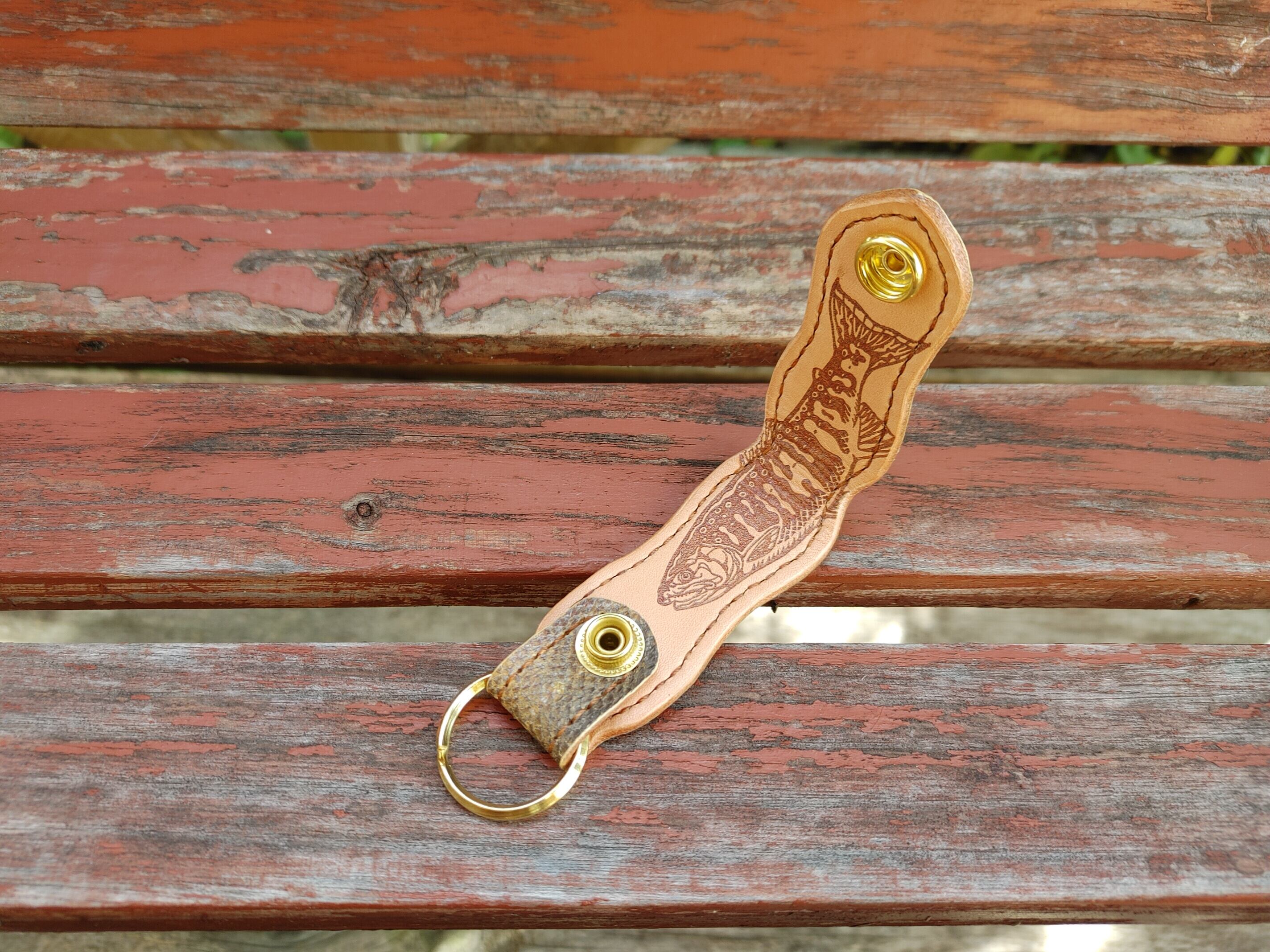 お茶のタンニンで鞣したビワマス皮を使用しているキーホルダーです。まだ少し魚っぽい香りが残っていますが、徐々に薄れていきます。
